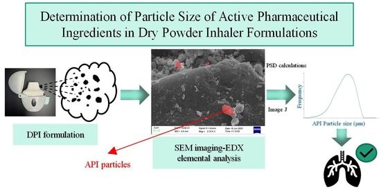Background/Objectives: Accurate determination of active pharmaceutical ingredient (API) particle size within dry powder inhaler (DPI) formulations is essential for ensuring effective pulmonary delivery but remains analytically challenging due to low API content and micronized particle size. Methods: In this study, scanning electron microscopy (SEM) coupled with energy-dispersive X-ray microanalysis (EDX) was used to directly identify and calculate the API particle size within several different commercial DPI products fit for purpose under regulatory constraints. The method exploits unique elemental markers inherent to each API, enabling reliable discrimination from excipients without prior sample modification or API extraction. Results: Large-area SEM–EDX mapping was used to localize API particles, followed by high-magnification imaging and confirmatory spot microanalysis. Particle sizes were manually measured for at least 50 API particles per formulation using image analysis software, and particle size distribution parameters were calculated from equivalent spherical diameters. Conclusions: The methodology was successfully applied to Spiriva®, Anoro® Ellipta, and Relvar® Ellipta inhalation powders, revealing micronized APIs with distinct morphological features and verifying systematic application across products. Cross-validation against laser diffraction measurements of pure APIs demonstrated statistical equivalence, confirming the robustness and analytical utility of the proposed method for particle size assessment in DPI formulations. Full article