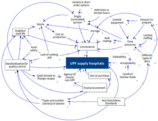Background: The increasing consumption of ultra-processed foods (UPFs) is concerning, given their negative impacts on environmental sustainability and human health. Evidence suggests a substantial presence of UPFs in health-promoting settings. However, the factors driving these procurement and service delivery decisions remain largely unexplored. Aim: To develop a conceptual model of the known and potential system drivers of UPFs in hospital food services. Methods: Dietitians from purposively sampled Australian hospitals participated. Group model-building workshops followed pre-established scripts from the system dynamics literature. A series of causal loop diagrams identifying drivers of UPF supply in hospitals was developed using model-building software. Primary and secondary drivers were derived inductively from participants and cross-checked against transcripts to produce the consolidated model. Results: The model presents six primary drivers (hospital menu and nutrition standards, food procurement and contracts, cost, standardisation for quality control, shelf life, and convenience) and nineteen secondary drivers that together explain the increased supply of UPFs in hospitals. Feedback loops were apparent, with drivers mutually reinforcing one another. Conclusions: Complex and interconnected drivers explain the increasing supply of UPFs in hospitals. Findings should inform future strategies to build sustainable food systems through improving food provision and reducing UPF supply in hospitals. Full article