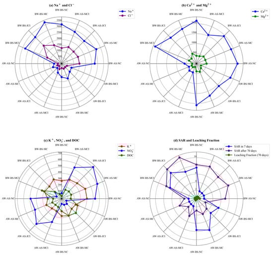 Brackish water is becoming an increasingly important resource for agricultural irrigation due to limited freshwater availability; however, concerns persist regarding its potential to degrade soil quality and reduce crop yields. This study evaluated the combined effects of irrigation water quality (brackish water, electrical conductivity (EC) of 2958 µS/cm; agricultural water, EC 796 µS/cm), soil type (agricultural soil and reclaimed desert soil), and compost treatments (no compost, mulch compost, Johnson-Su compost, and mulch compost incorporation) on soil health and chili pepper (Capsicum annuum) growth under greenhouse conditions. Compost amendments significantly improved plant height by 58–213%, root length by 35–166%, and wet biomass by 154–1400% compared to control treatments. Agricultural water maintained lower soil EC (0.553–0.870 mS/cm) than brackish water (0.751–1.104 mS/cm), while Johnson-Su compost most effectively reduced salinity impact on plant growth. Leached water analysis showed higher Na+, Cl, and SO42− mobility under brackish irrigation, with compost treatments enhancing nutrient retention and soil moisture by buffering salinity stress with carboxylic group and cation exchange capacity. Johnson-Su compost incorporation consistently mitigated the negative effects of brackish irrigation by reducing sodium accumulation, improving chloride mobility, and enhancing soil nitrogen dynamics. These results highlight that combining high-quality irrigation water and biologically active composts improves soil health and plant productivity, while brackish water use requires soil amendments to mitigate salinity risks. Full article
