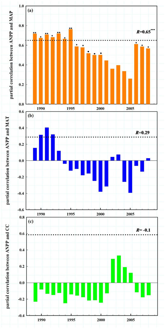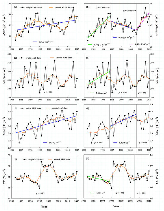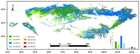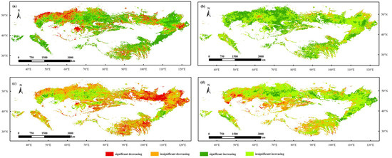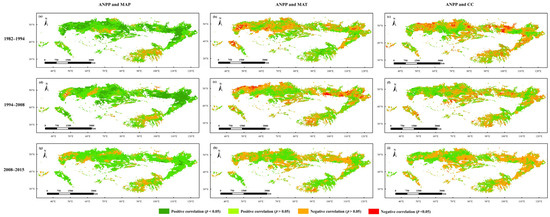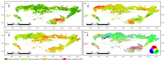 −3/a. Spatial trend distributions indicated that increasing trends in temperature and precipitation were evident across the entire region, while trends in soil moisture showed significant spatial variation. (2) During 1982 to 2022, the vegetation greening trend was 0.002/10a, indicating a gradual improvement in vegetation growth in the study area. The spatial distribution of monthly average NDVI values revealed that the main growing season of vegetation spanned April to November, with peak NDVI values occurring in June–August. Combined with serial partial correlation and spatial partial correlation analysis, temperatures during April to May effectively promoted the germination and growth of vegetation, while soil moisture accumulation from June to August (or January to August) effectively met the water demand of vegetation during its growth process, with a significant promoting effect. Geographical detector results demonstrate that temperature exhibits the strongest explanatory power for NDVI variation, whereas land cover has the weakest. The synergistic promotional effect of multiple climatic factors is highly pronounced. (3) Wavelet analysis revealed that the periodic characteristics of NDVI and climate variables over a 2–15-year timescale may have been associated with the impacts of atmospheric circulation. Taking NDVI and climatic factors from June to August as an example, before 2000, temperature was the dominant influencing factor, followed by precipitation and soil moisture; after 2000, precipitation and soil moisture became the primary drivers. The North Atlantic Oscillation (NAO) and Arctic Oscillation (AO) were the primary atmospheric circulation patterns influencing vegetation variability in the region. Their effects were reflected in the inverse relationship observed between NAO/AO indices and NDVI, with typical phases of high and low NDVI closely corresponding to shifts in NAO and AO activity. This study helps us to understand how plants have been changing in the upper parts of the Irtysh River. These insights are critical for guiding efforts to develop the area in a way that is sustainable and beneficial for the environment.