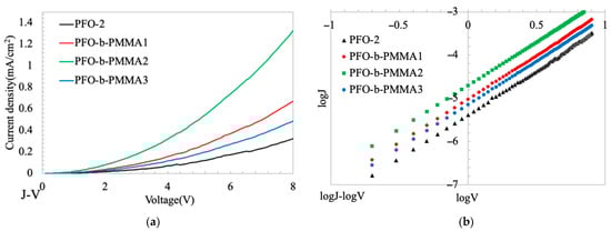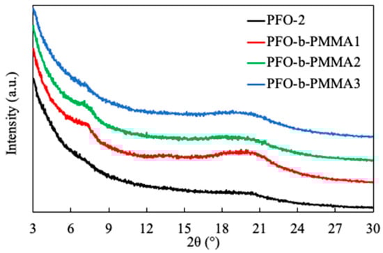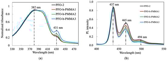 Poly(9,9-di-n-octylfluorene) (PFO) suffers from interchain aggregation, which degrades its blue spectral stability and charge transport. To address this, a series of rod-coil diblock copolymers (PFO-b-PMMAs) with varying poly(methyl methacrylate) (PMMA) chain lengths were synthesized via Steglich coupling. The non-conjugated PMMA blocks act as bulky steric spacers in the solid state, effectively suppressing detrimental PFO aggregation and enhancing pure blue emission stability. Furthermore, moderate PMMA blocks (PFO-b-PMMA1 and PFO-b-PMMA2) promote favorable β-phase formation and ordered crystalline packing. This microstructural optimization yields a maximum electron mobility of 1.98 × 10−6 cm2/(V·s) for PFO-b-PMMA2, markedly higher than the PFO-2 homopolymer (4.13 × 10−7 cm2/(V·s)). However, an overlong PMMA block (PFO-b-PMMA3) introduces excessive steric hindrance (Tg = 66 °C) that disrupts crystallization, acting as an insulating barrier that reduces mobility. Thus, precisely tuning the non-conjugated block length effectively maximizes both the blue spectral stability and electron transport capabilities of PFO-based materials. Full article
