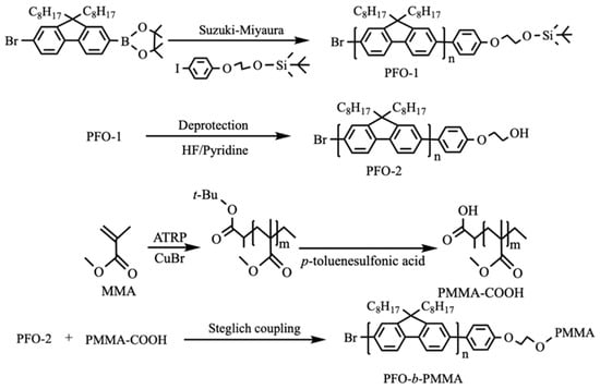 Poly(9,9-di-n-octylfluorene) (PFO) suffers from interchain aggregation, which degrades its blue spectral stability and charge transport. To address this, a series of rod-coil diblock copolymers (PFO-b-PMMAs) with varying poly(methyl methacrylate) (PMMA) chain lengths were synthesized via Steglich coupling. The non-conjugated [...] Read more.