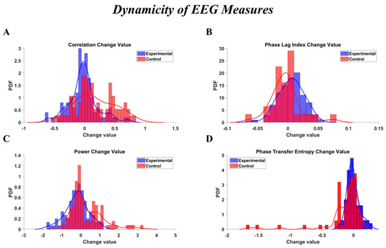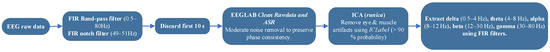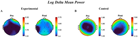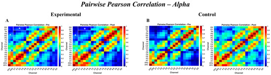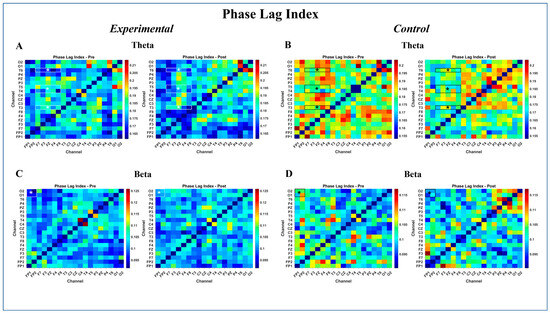 n = 24). EF was evaluated pre- and post-intervention using validated measures: the Wisconsin Card Sorting Test, Stroop Color–Word Test, Corsi Block-Tapping Task, and Tower of London. Resting-state EEG data (19 channels, 250 Hz) were recorded before and after the intervention and analyzed for spectral power, pairwise Pearson correlation, phase-based functional connectivity using the Phase Lag Index (PLI), and directed effective connectivity using Phase Transfer Entropy (PTE). EEG effects were tested with linear mixed models in MATLAB (fitlme), with the measured values in each ROI as the dependent variable, group and time as fixed effects, and SubjectID included as a random intercept; EF outcomes were analyzed with ANCOVA/MANCOVA, adjusting post-test scores for baseline. The assumptions of homogeneity of slopes, Levene’s test, and the Shapiro–Wilk test were examined, and the Holm–Bonferroni correction together with partial η