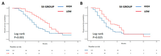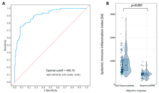 Background: Gemcitabine–cisplatin (GC) combined with a programmed death-ligand 1 (PD-L1) inhibitor has become an important first-line regimen for advanced intrahepatic cholangiocarcinoma (ICC). However, overall efficacy remains modest, and inter-patient heterogeneity in outcomes is substantial, highlighting the need for simple biomarkers for pretreatment risk stratification. The systemic immune-inflammation index (SII), derived from peripheral neutrophil, lymphocyte, and platelet counts, has been associated with prognosis in various malignancies, but its clinical relevance in advanced ICC treated with first-line GC plus PD-L1 inhibitor remains unclear. Aims: To evaluate the association of baseline SII with objective response and survival outcomes in patients with advanced ICC receiving first-line GC plus PD-L1 inhibitor. Methods: We retrospectively analyzed 193 consecutive patients with advanced ICC who received first-line GC plus a PD-L1 inhibitor at our center. Baseline clinicopathologic characteristics and laboratory parameters were collected, and SII was calculated as platelet count (×109/L) × neutrophil count (×109/L)/lymphocyte count (×109/L). Receiver operating characteristic (ROC) analysis was performed to assess the discriminative ability of baseline SII for objective response and to determine an internally derived cut-off value. Patients were categorized into low- and high-SII groups accordingly. Logistic regression was used to identify factors associated with objective response rate (ORR). Progression-free survival (PFS) and overall survival (OS) were estimated by the Kaplan–Meier method and compared using the log-rank test. Multivariable Cox proportional hazards models were constructed to evaluate the independent prognostic significance of SII for PFS and OS. Results: Among the 193 patients included, 55 achieved complete or partial response and 138 had stable or progressive disease, yielding an ORR of 28.5%. Baseline SII showed good discrimination for objective response (AUC = 0.91), and the optimal cut-off value was 495.75. Patients in the low-SII group had a significantly higher ORR than those in the high-SII group (p < 0.001). Kaplan–Meier analysis demonstrated that both PFS and OS were longer in the low-SII group than in the high-SII group (median OS: 13.0 vs. 8.0 months, log-rank p < 0.001; median PFS: 8.5 vs. 6.0 months, p = 0.025). In multivariable Cox models adjusting for differentiation, CA19-9, tumor multiplicity, and distant metastasis, SII grouping remained independently associated with PFS and OS, and distant metastasis was consistently associated with increased risks of progression and death. Conclusions: Baseline SII is a readily available prognostic biomarker associated with objective response and survival in patients with advanced ICC treated with first-line GC plus PD-L1 inhibitor. Given the retrospective single-center design, the absence of a non-immunotherapy comparator cohort, and internal cut-off derivation, these findings should be interpreted as hypothesis-generating and warrant external validation. Full article