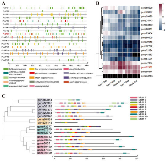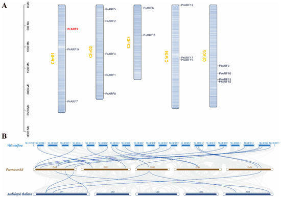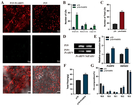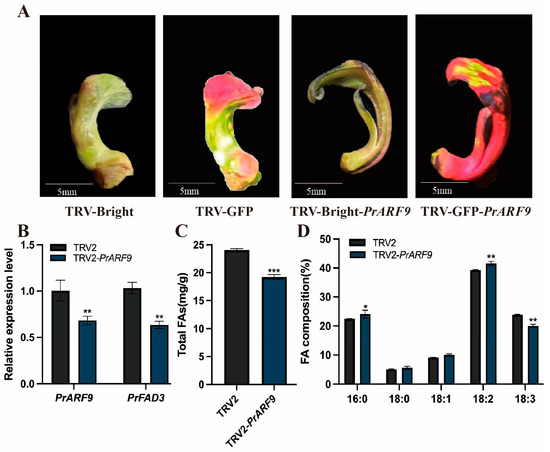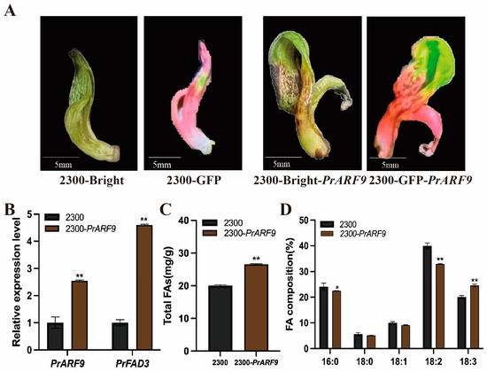 Fatty acids play critical roles in plant growth and stress adaptation, primarily through modulating membrane fluidity. This study combined bioinformatics (genome-wide identification and chromosomal localization) with experimental techniques (RT-qPCR, VIGS, and GC) to investigate the ARF family in Paeonia rockii. Seventeen PrARF genes were identified, showing evolutionary collinearity with Arabidopsis thaliana and Vitis vinifera and uneven chromosomal distribution. Among these, PrARF9 was specifically and highly expressed during late seed development, exhibiting a pattern highly consistent with the fatty acid synthesis key gene PrFAD3 and the accumulation trend of α-linolenic acid (ALA). In Nicotiana benthamiana, transient overexpression of PrARF9 upregulated its homologous gene NbFAD3, resulting in increased total fatty acid content and elevated lipid droplet accumulation. In contrast, in Paeonia rockii, silencing of PrARF9 downregulated PrFAD3 expression and reduced fatty acid levels, whereas overexpression of PrARF9 produced the opposite effect. We present a comprehensive analysis of the ARF gene family in P. rockii, combined with functional verification of a candidate gene regulating lipid synthesis. In summary, PrARF9 positively regulates PrFAD3, thereby participating in oil accumulation and ALA synthesis in P. rockii. Full article