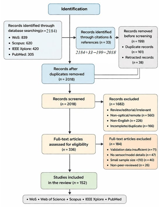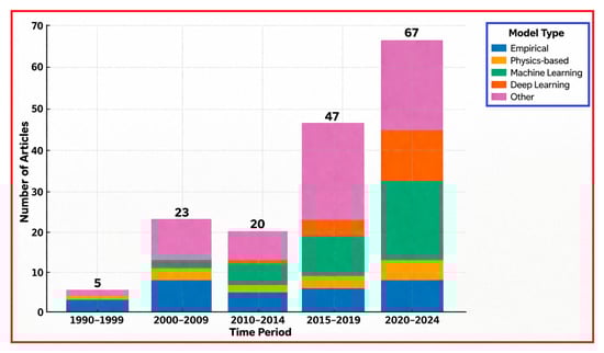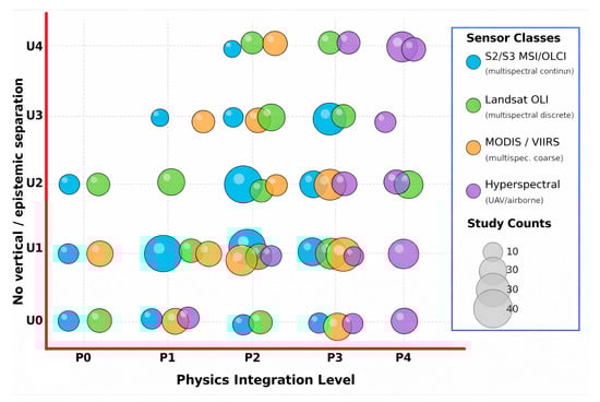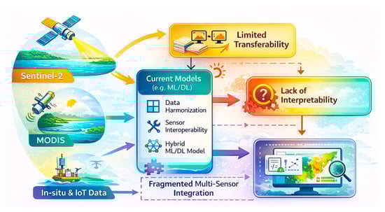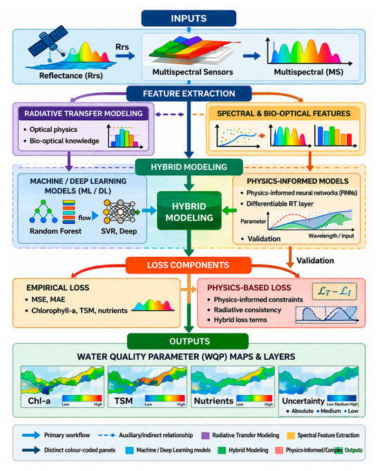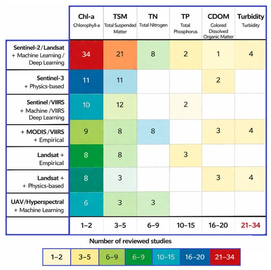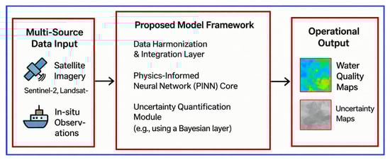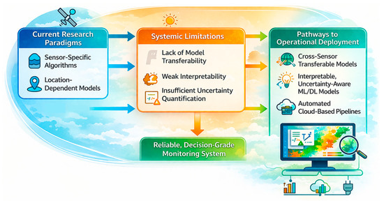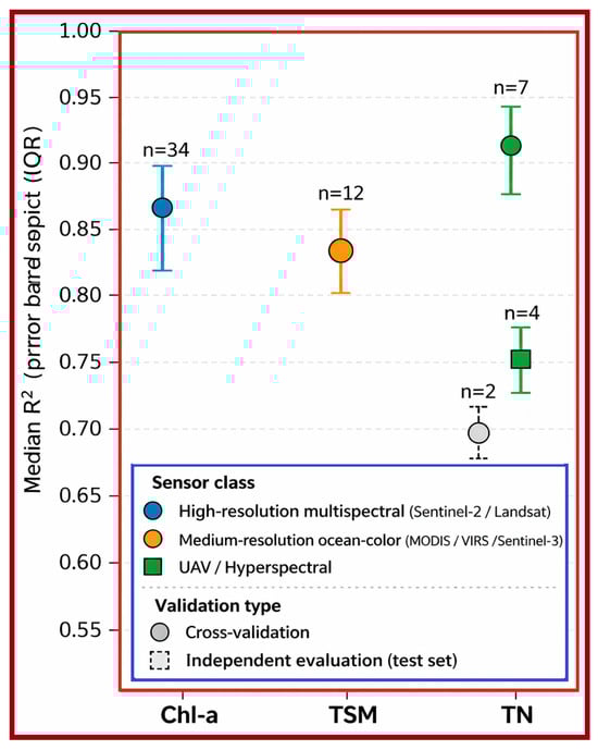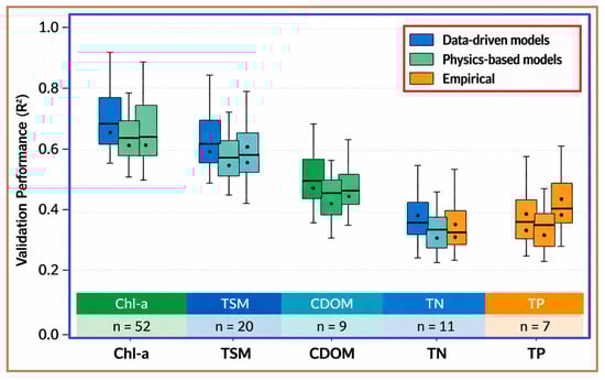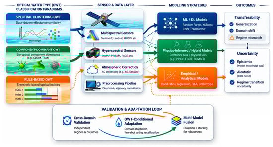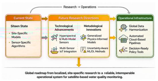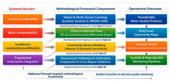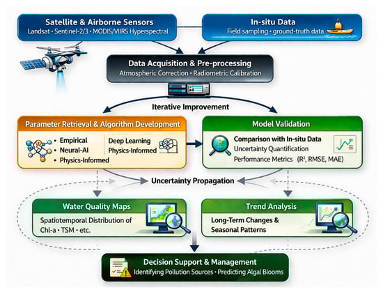 Satellite remote sensing has become essential for water quality assessment across inland and coastal environments, with rapid improvements in recent years. Significant advances have been made in detecting optically active parameters (such as chlorophyll-a, suspended matter, and turbidity), showing consistently strong performance across multiple studies. Specifically, the median validation performance (R2) derived from the quantitative synthesis indicates R2 = 0.82 for chlorophyll-a (interquartile range—IQR: 0.75–0.90), R2 = 0.80 for total suspended matter (IQR: 0.78–0.85), and R2 = 0.88 for turbidity (IQR: 0.85–0.90). Conversely, the retrieval of optically inactive parameters (such as nutrients like total phosphorus and total nitrogen) remains more context dependent. It exhibits moderate, more variable results, with median R2 = 0.68 (IQR: 0.64–0.74) for total phosphorus and R2 = 0.75 (IQR: 0.70–0.80) for total nitrogen. These findings clearly illustrate the varying success of retrievals of optically active and inactive parameters and underscore the inherent difficulties of indirect estimation methods. However, high reported accuracy has yet to translate into transferable, uncertainty-informed, and operational monitoring systems. This gap stems from structural issues in validation design, physics integration, uncertainty management, and multi-sensor compatibility rather than data limitations alone. We present a PRISMA-guided, distribution-aware quantitative synthesis of 152 peer-reviewed studies (1980–2025), based on a systematic search protocol, to evaluate satellite-based retrievals of both optically active and inactive parameters. Instead of simply averaging performance, we analyse the empirical distributions of validation metrics, considering the validation protocol, sensor type, parameter category, degree of physics integration, and uncertainty quantification. The synthesis demonstrates that validation strategy often influences reported results more than the algorithm class itself, with accuracy inflated under non-independent cross-validation methods and notable variability between studies concealed by mean-based reports. Across four decades, four persistent structural challenges remain: limited transferability across sites and sensors beyond calibration areas; weak or implicit physical integration in many data-driven models; lack of or inconsistency in uncertainty quantification; and fragmented multi-sensor harmonisation that restricts operational scalability. To address these issues, we introduce two evidence-based coding frameworks: a physics-integration taxonomy (P0–P4) and an uncertainty-quantification hierarchy (U0–U4). Applying these frameworks shows that most studies remain focused on low-to-moderate levels of physics integration and primarily consider uncertainty at the prediction stage, with limited attention to upstream sources throughout the observation and inference process. Building on this structured synthesis, we propose a transferable, physics-informed, and uncertainty-aware conceptual framework that links model architecture, validation robustness, and probabilistic uncertainty to well-founded design principles. By shifting satellite water quality modelling from isolated algorithm demonstrations towards integrated, evidence-based system design, this study promotes scalable, decision-grade environmental monitoring amid the accelerating impacts of climate change. Full article