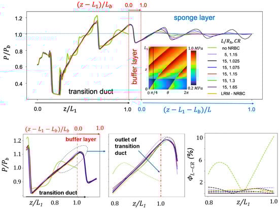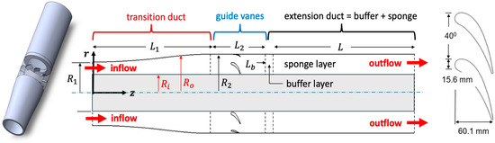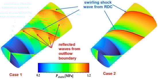 This study examines outflow boundary conditions (BCs) in computational fluid dynamics (CFD) simulations of a transition duct with and without guide vanes that converts supersonic flow exiting a rotating detonation combustor (RDC) to subsonic flow to drive a turbine. Since the flow exiting the transition duct has swirling shock waves with significant spatial and temporal variations in pressure, temperature, and Mach number, imposing proper BCs poses a challenge. To ensure all swirling shock waves exit the transition duct without creating non-physical reflected waves at its outlet, this study examined three outflow BCs: (1) the average pressure imposed at the duct’s outlet, (2) a nonreflecting BC (NRBC) with a specified average pressure imposed at the duct’s outlet, (3) the average pressure imposed at the outlet of an extension duct made up of a buffer layer and a sponge layer. This study is based on the three-dimensional, unsteady density-weighted-ensemble-averaged continuity, Navier–Stokes, and energy equations for a thermally perfect gas closed by the realizable k–ε model and “enhanced” wall functions. The results obtained show that imposing an average pressure at the transition duct’s outlet produces spurious waves that degrade the physical meaningfulness of the solution. When the NRBC was applied, swirling shock waves exited the duct’s outlet without creating spurious waves. However, its usage requires the gas to be thermally, as well as calorically, perfect, which this study shows could be a concern. By imposing the average pressure at the outlet of an extension duct, the gas does not need to be calorically perfect. The results obtained show the effects of the sponge layer’s length and coarsening ratio on damping nonuniformities in non-physical reflected waves to ensure the flow exiting the transition duct’s outlet can do so as if there are no boundaries present and has the desired average pressure—even though the BC is applied at the extension duct’s outlet. Full article