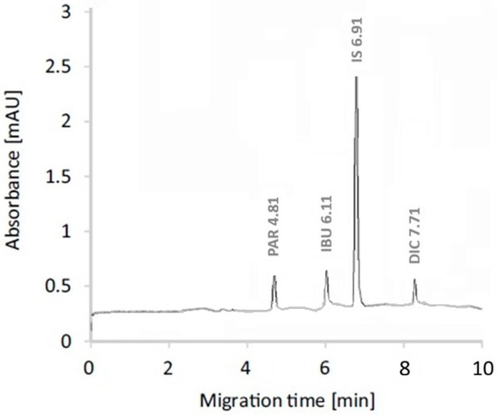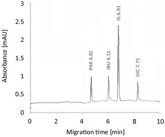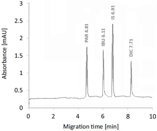 Pharmaceutical residues in aquatic environments represent a significant pollution concern, particularly in regions experiencing rapid healthcare and industrial growth. This study presents a sensitive and environmentally sustainable analytical method for monitoring paracetamol (PAR), ibuprofen (IBU), and diclofenac sodium (DIC) in pharmaceutical wastewater from Al-Kharj Governorate, Saudi Arabia. The method integrates off-line solid-phase extraction (SPE) with field-amplified sample stacking (FASS) prior to capillary electrophoresis (CE), enabling effective dual preconcentration and enhanced detection sensitivity. Key parameters affecting separation and enrichment, including background electrolyte composition, pH, injection conditions, stacking efficiency, and SPE sorbent selection, were systematically optimized. Under optimal conditions, the SPE–CE–FASS method demonstrated excellent linearity (r2 ≥ 0.997) over the concentration range of 10–1000 ng L−1, with strong precision (intra- and inter-day RSD ≤ 6%) and high recoveries (91.8–98.5%) in pharmaceutical wastewater samples. Matrix-based limits of detection were 4.0 ng L−1 for PAR, 3.5 ng L−1 for IBU, and 3.0 ng L−1 for DIC. The method was successfully applied to real wastewater samples, where all target analytes were detected at environmentally relevant concentrations. Owing to its low solvent consumption, reduced waste generation, and high sensitivity, the proposed SPE–CE–FASS method offers a reliable, cost-effective, and environmentally friendly approach for routine monitoring of pharmaceutical residues in complex wastewater matrices. Full article