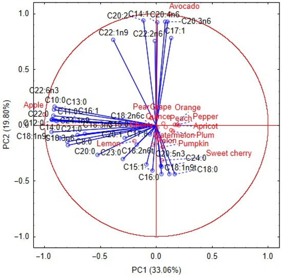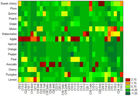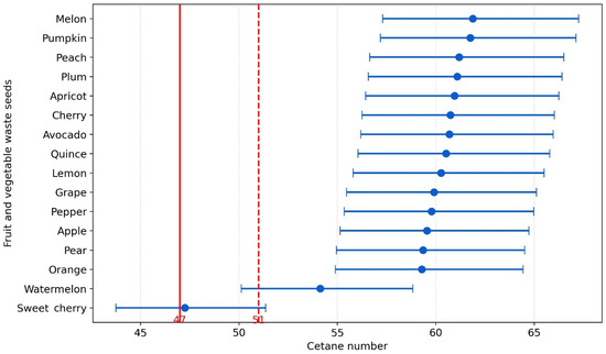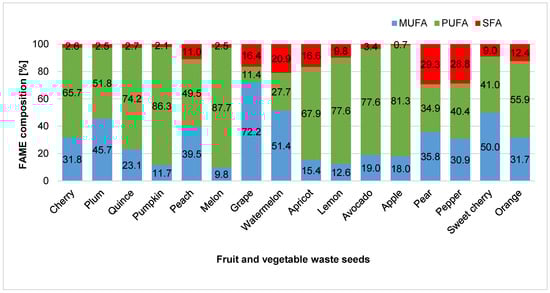 This study explores the potential of seeds from fruit and vegetable processing waste as feedstocks for biodiesel biocomponent production. Fatty acid methyl esters (FAMEs), obtained through a transesterification reaction, were extracted using ultrasound-assisted extraction and identified by gas chromatography–mass spectrometry (GC–MS) in selected ion monitoring (SIM) mode. A total of 31 to 34 individual FAME compounds were identified across all samples. The fatty acid profiles varied both quantitatively and qualitatively depending on the raw material; however, unsaturated FAMEs predominated over saturated ones in all cases. The highest proportions were observed for γ-linolenic acid (C18:3n6), particularly in apple, melon, lemon, and pumpkin seeds. Substantial contributions of oleic acid (C18:1n9c) were found in apple, quince, cherry, and melon seeds, while linolelaidic acid (C18:2n6t) dominated in melon, pumpkin, quince, and cherry seeds. The highest total FAME contents were recorded for apple, melon, lemon, and pumpkin seeds, while the lowest values were observed in apricot and pepper seeds. Among the materials studied, grape seeds proved to be the most promising feedstock, exhibiting a favorable cetane number and a beneficial fatty acid profile characterized by high monounsaturated fatty acid (MUFA) content, low polyunsaturated fatty acid (PUFA) content, and a moderate fraction of saturated fatty acids (SFAs). Plum and peach seeds also showed significant potential, but their higher PUFA levels may compromise oxidative stability and could require antioxidant supplementation or blending with MUFA-rich feedstocks. Full article