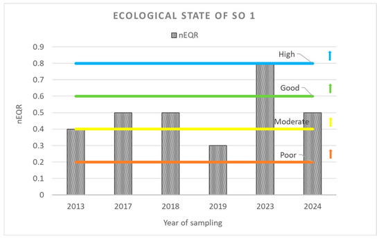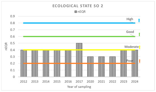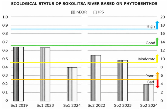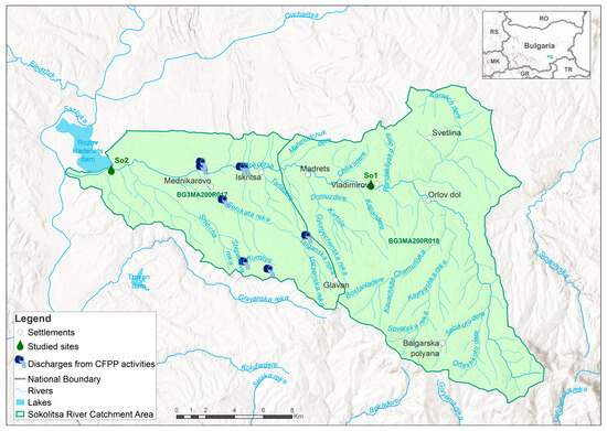 Coal-fired power plants can adversely affect aquatic ecosystems through wastewater discharge, waste landfills, and the atmospheric deposition of toxic substances released during coal combustion. These processes degrade the water quality of nearby surface and underground water bodies. The study presents the impact of the coal-fired power plant Contour Global Maritza East 3 on the ecological status of the Sokolitsa River, reflected by changes in the composition and structure of the sensitive phytobenthos and macrozoobenthos communities and supporting environmental variables, including water temperature, pH, dissolved oxygen, conductivity, nutrients, sulfates, calcium, and calcium carbonate hardness. Methods for monitoring and assessing the ecological status of surface water bodies compliant with European and national legislation were applied to the studied biological quality elements and key physicochemical variables. Historical monitoring data from a ten-year period, 2013–2022, together with data collected during the study in 2023 and 2024 were analyzed and evaluated. The results indicated a significant increase in most physicochemical variables downstream of the CFPP compared with the upstream site, including water temperature, conductivity, calcium carbonate hardness, calcium, sulfates and nitrogen (N) nutrients (ammonium N, nitrite N, nitrate N, total N). The ecological status of the river deteriorated, as indicated by the negatively affected aquatic habitats and the changes in the taxonomic richness and abundance of the studied organism groups. Full article