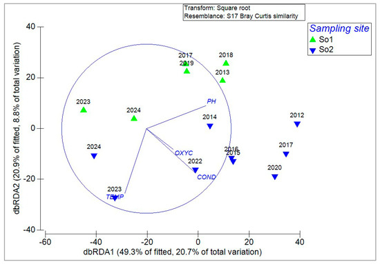Urban coastal wetlands along the Peruvian Pacific coast are increasingly affected by urban expansion, pollution, and hydrological alterations, compromising their ecological integrity. In this context, the spatiotemporal variation of the aquatic macrophyte community and its relationship with limnological conditions and drivers of change were evaluated in the Santa Rosa wetland (Chancay, Lima). The objective is to evaluate the spatiotemporal variation of the aquatic macrophyte community in the Santa Rosa wetland and analyze its relationship with physicochemical limnological variables and drivers of change. Sampling was conducted during two contrasting hydrological seasons in 2022: T1 (low-water season) and T2 (high-water season), at six sampling points (P1–P6). Physicochemical variables (water depth, temperature, pH, conductivity, total dissolved solids—TDS, total suspended solids—TSS, dissolved oxygen—DO, turbidity, nitrate—NO3, ammonium—NH4+, phosphate—PO43−, and dissolved organic matter—DOM) were measured, and the relative abundance of aquatic macrophytes was evaluated. Drivers of change were identified through direct observation and a structured matrix, with phosphate a PCoA performed to summarize spatiotemporal trends. Data were analyzed using Principal Component Analysis (PCA), Co-inertia analysis, and Multi-Response Permutation Procedures (MRPP). Significant spatiotemporal variation was observed in physicochemical parameters (p < 0.05), with moderate covariation between the two matrices (RV = 0.47). A total of ten aquatic macrophyte species were recorded, with higher abundance of Pontederia crassipes and Pistia stratiotes in T1, and Hydrocotyle ranunculoides and Bacopa monnieri in T2. The most relevant drivers of change were solid waste, livestock grazing, organic contamination, and urban expansion. Spatial heterogeneity was observed in the drivers of change affecting the Santa Rosa wetland, forming a mosaic of areas with different impact profiles. Despite multiple anthropogenic pressures, the Santa Rosa wetland maintains a limnological structure and a functionally coupled macrophyte community, suggesting that essential ecological processes are maintained within the temporal scope of this study. The observed covariation between physicochemical conditions and vegetation confirms the persistence of essential ecological processes, even within an altered urban context. This study demonstrates that integrating biotic components, limnological variables, and drivers of change is fundamental to understanding and monitoring the ecological dynamics of urban wetlands along the Peruvian coast. Full article