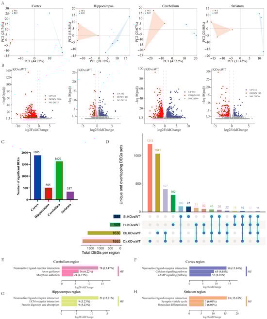 Glutamate delta 1 receptor (GluD1) has various functional roles in the brain, such as high-frequency hearing, synapse formation and maintenance, and regulation of cognition disorders and neurodevelopmental disease. However, the underlying molecular mechanism, especially at the genetic level, remains to be elucidated. In this study, we use transcriptomics analysis to define the genetic impact of GluD1 across the brain regions in GluD1 knockout mice. Our results show that GluD1 deletion induced pronounced differences in gene expression both across the four brain regions (cortex, cerebellum, hippocampus, and striatum) and the distinct hippocampal subregions. Despite differences in transcriptional profiles, the differentially expressed genes (DEGs) across all four brain regions show significant enrichment in synaptic signaling pathways, highlighting the critical role of GluD1 in synaptic function. The GluD1 interaction network and its downstream target genes are closely linked to the pathogenesis of intellectual disability (ID) and autism spectrum disorders (ASDs). In conclusion, our work reveals that GluD1 deletion leads to brain-region-specific transcriptional changes and establishes a genetic link between the interaction network with GluD1 and the risk genes for ID and ASD. Full article