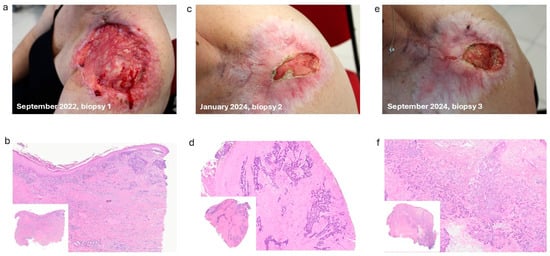 Basal cell carcinoma (BCC) is the most common skin cancer, predominantly affecting sun-exposed areas. It typically grows slowly and rarely metastasizes, though untreated cases can cause significant tissue destruction and morbidity. Its pathogenesis primarily involves dysregulation of the Hedgehog (HH) signaling pathway, mainly [...] Read more.